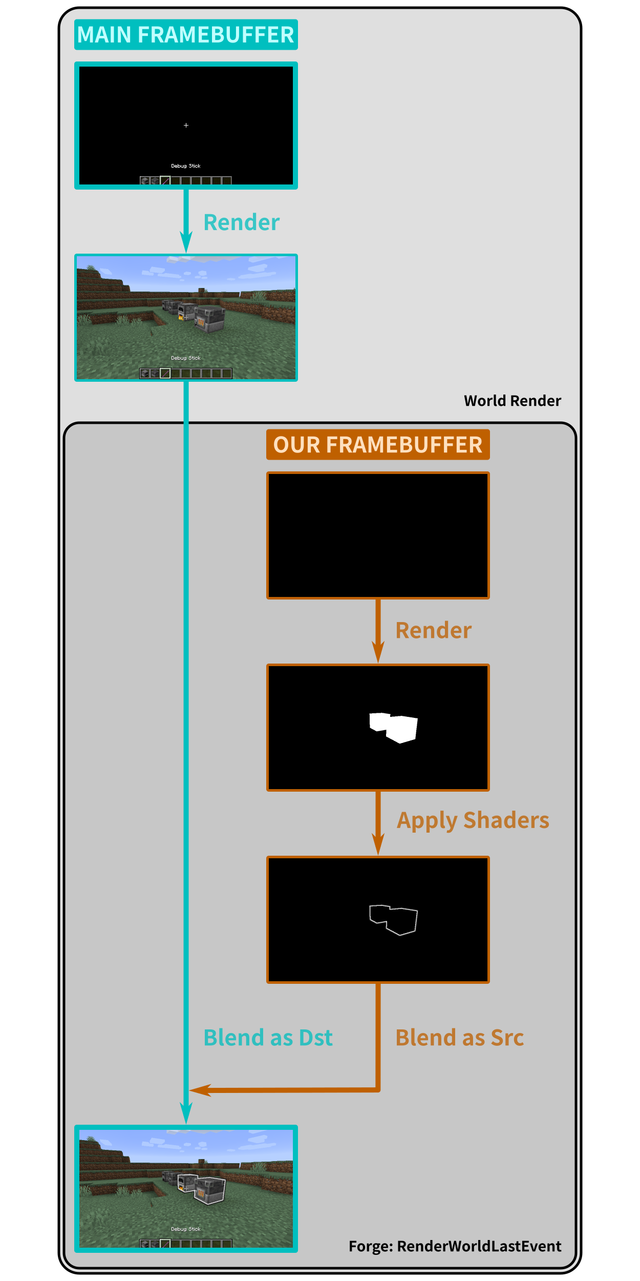 因为计算边缘这一特定需求,因此发光效果必须单独渲染,不能和已有的世界渲染等直接混合(否则世界中其他的「边缘」便会一并囊括进来),这也是我们需要在渲染过程中引入额外帧缓冲 (Framebuffer)的必要性所在。
